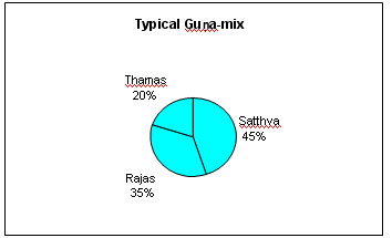 - Every individual has the three guṇas in a certain broad proportion, but at any point of time, there may be a preponderance of one or the other. The way we react to a situation depends on which guṇa is dominant at that point of time. That is why it is very difficult to predict how we may react to a given situation. If agitated we may be in rajas and when we do not act, we may be in thamas.